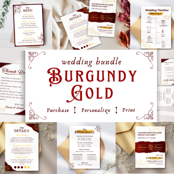 Editable Burgundy & Gold Wedding Invitation: Includes 8 Templates