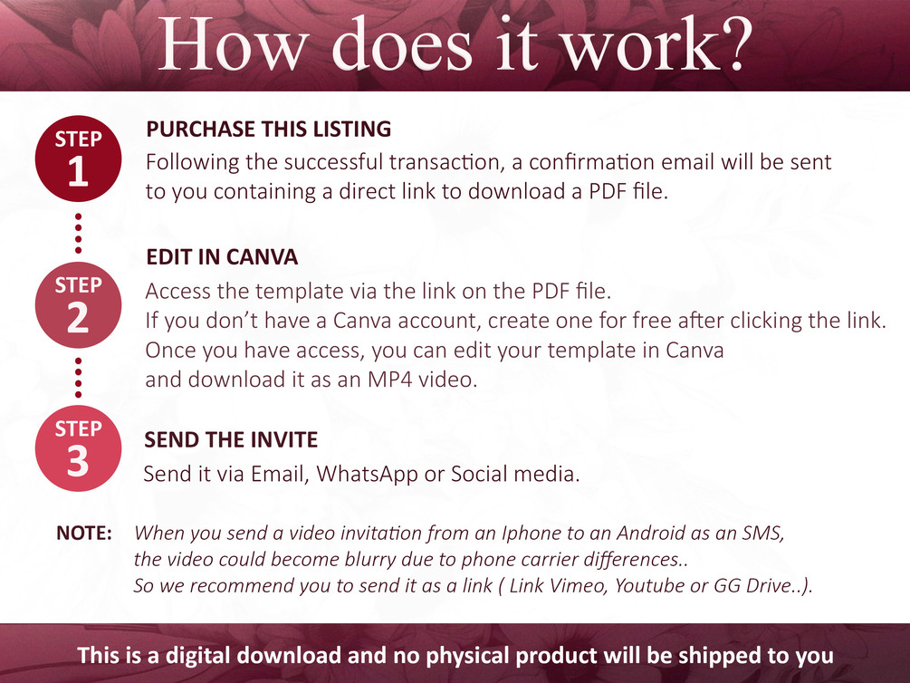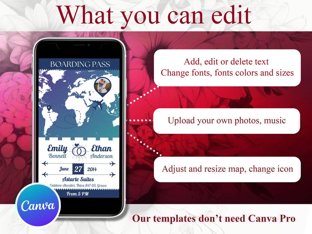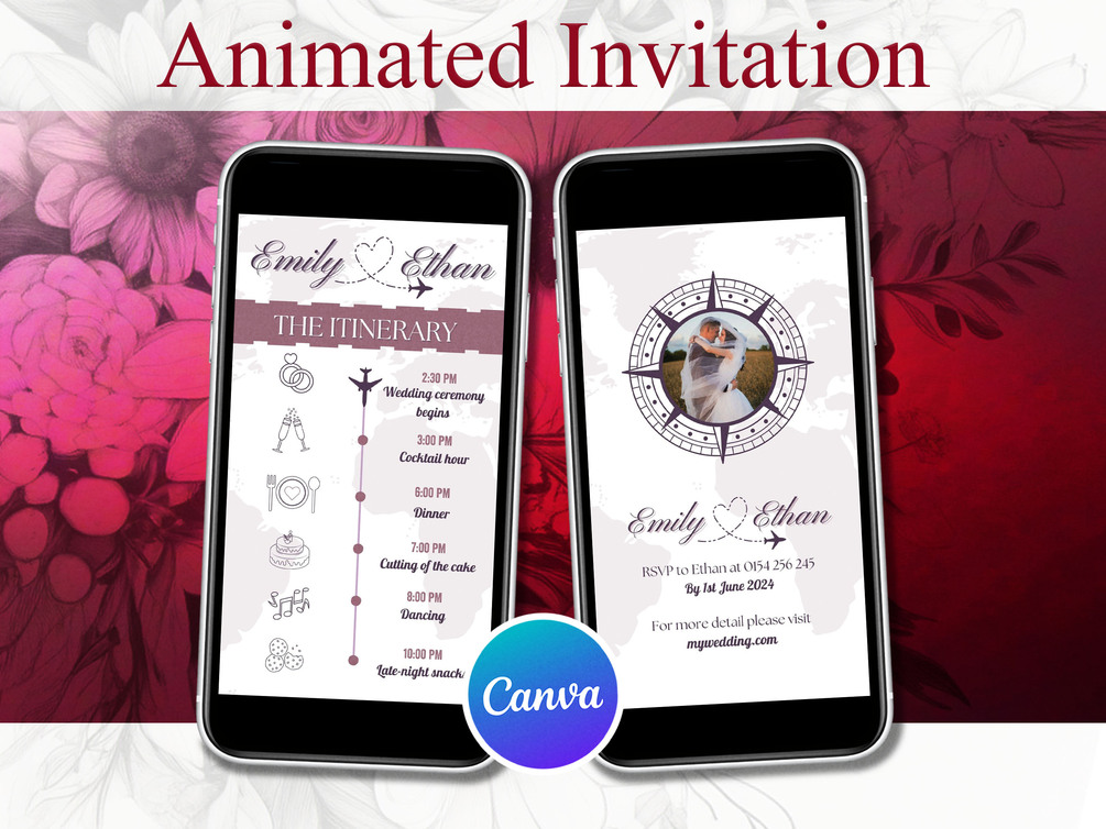 •Animated Wedding Invitation Video Template editable in the Free Version of Canva. You can access Canva on desktop computers, phones, and tablets. Windows, Mac, iOS, Android.